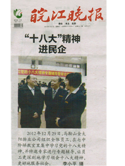 2013年1月2日的《皖江晚報》上就金太陽物業(yè)組織學(xué)習(xí)十八大精神輔導(dǎo)主題會進(jìn)行了報道,報道中說:2012年12月29日,馬鞍山市金太陽物業(yè)公司組織全體員工,在七中階梯教室里集中學(xué)習(xí)黨的十八大精神,并特邀專家進(jìn)行專題輔導(dǎo),讓員工更深刻地學(xué)習(xí)領(lǐng)會十八大精神,更好地服務(wù)社會。