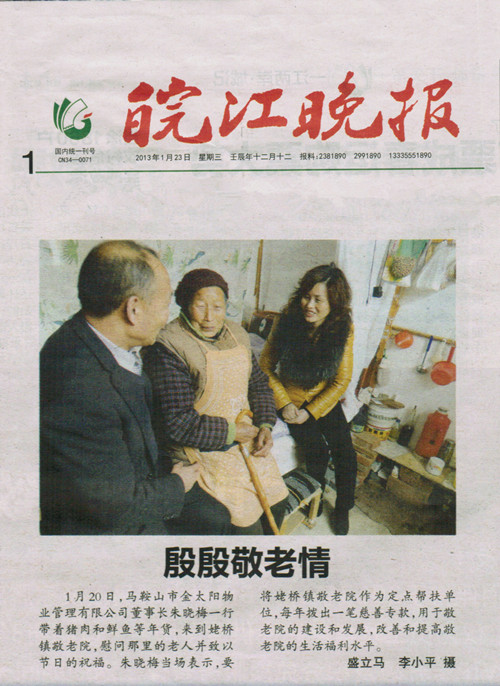 1月20日,馬鞍山市金太陽物業(yè)管理有限公司董事長朱曉梅一行帶著豬肉和鮮魚等年貨,來到姆橋敬老院,慰問那里的老人并致以節(jié)日的祝福。朱曉梅當(dāng)場表示,要將姆橋鎮(zhèn)敬老院作為定點(diǎn)幫扶單位,每年撥出 慈善??睿糜诰蠢显旱慕ㄔO(shè)和發(fā)展,改善和提高敬老院的生活福利水平。