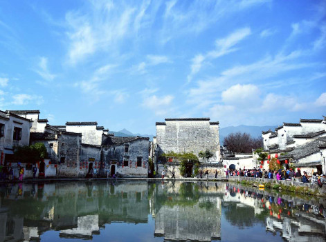 宏村位于安徽省黟縣東北部,地勢較高,常常云蒸霞蔚,時而如潑墨重彩,時而如淡抹寫意,恰似山水長卷,融自然景觀和人文景觀為一體,被譽為“中國畫里的鄉(xiāng)村”。整個村子呈“?!毙徒Y(jié)構(gòu)布局,被譽為當今世界歷史文化遺產(chǎn)的一大奇跡。以村西北一溪鑿圳繞屋 過戶,九曲十彎的水渠,聚村中天然泉水匯合蓄成一口斗月形的池塘,這種科學的村落水系設(shè)計,不僅為村民解決了消防用水,而且調(diào)節(jié)了氣溫,為居民生產(chǎn)、生活用水提供了方便,創(chuàng)造了一種“浣汲未防溪路遠,家家門前有清泉”的良好環(huán)境。
