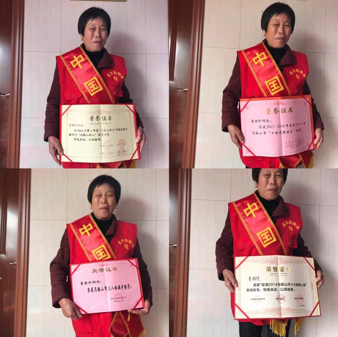 事跡簡介:童朝珍,馬鞍山市金太陽物業(yè)管理有限公司恒興路公廁管理員。19年來她把工作當(dāng)事業(yè)干,干一行、愛一行。她主動優(yōu)化服務(wù),在自身收入微薄的情況下仍然自掏腰包,為如廁者精心配置了拖鞋和地毯,在公廁里提供獨(dú)具特色的“星級服務(wù)”。她獲得過“2014年第三季度馬鞍山好人”、“2013-2014年度馬鞍山十佳道德模范”、“2014年度馬鞍山市十大新聞人物”、“馬鞍山市三八紅旗手”,今年11月再次獲得“全國住房和城鄉(xiāng)系統(tǒng)勞動模范”稱號。