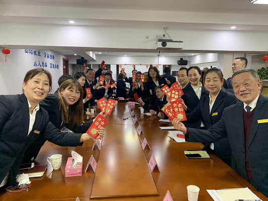 述職大會(huì)結(jié)束,“金太陽(yáng)” 董事長(zhǎng)朱曉梅女士親手為每位管理人員派發(fā)紅包,并送上新春的祝福!肯定了各述職人的工作成績(jī),鼓勵(lì)大家今后努力改進(jìn)工作上的一些不足,述職大會(huì)后,還進(jìn)行了集體合影和聚餐。
