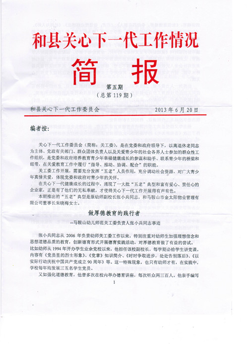 在《和縣關(guān)心下一代工作情況簡(jiǎn)報(bào)》第五期中報(bào)道了公司董事長(zhǎng)朱曉梅資助兩名困難學(xué)生的愛心善舉。 簡(jiǎn)報(bào)中寫道: 4月17日,馬鞍山市金太陽物業(yè)…
