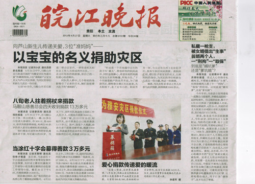 來(lái)自皖江晚報(bào)的報(bào)道《金太陽(yáng)物業(yè)為雅安災(zāi)區(qū)獻(xiàn)愛(ài)心》